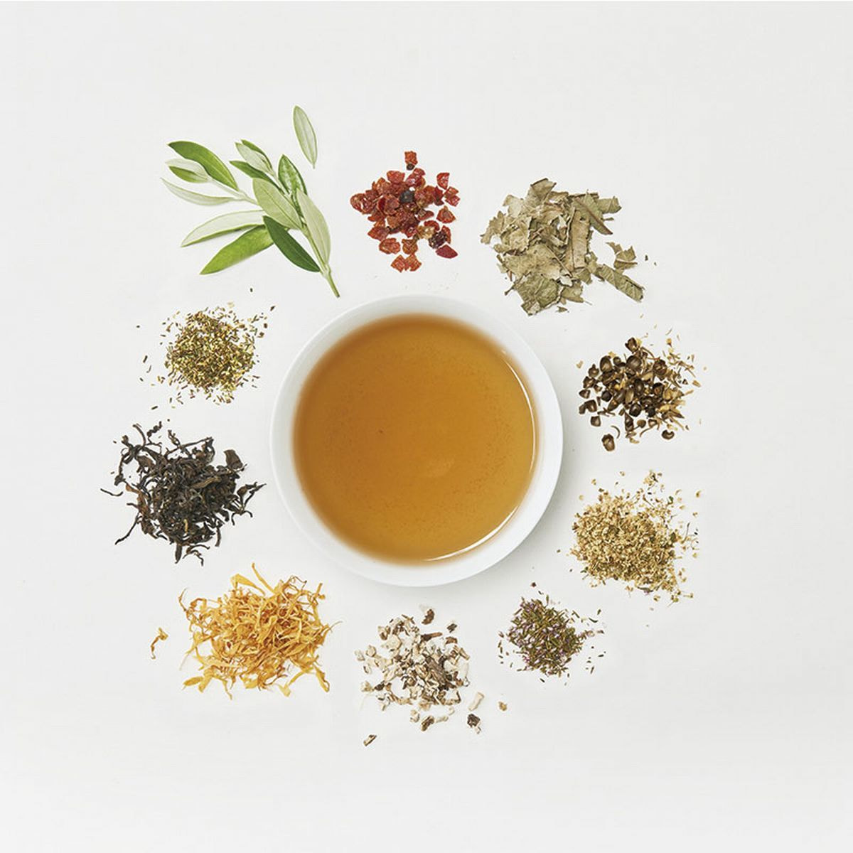 烏龍茶(台湾産)、ルイボスグリーン、ハトムギ、オリーブ、ローズヒップ、レッドグレープリーフ、グァバ葉、ネトル、バードックルート、ダンデリオンルート、ジュニパーベリー、マリーゴールド、ヒース、ローズマリー、エルダーフラワー、月見草